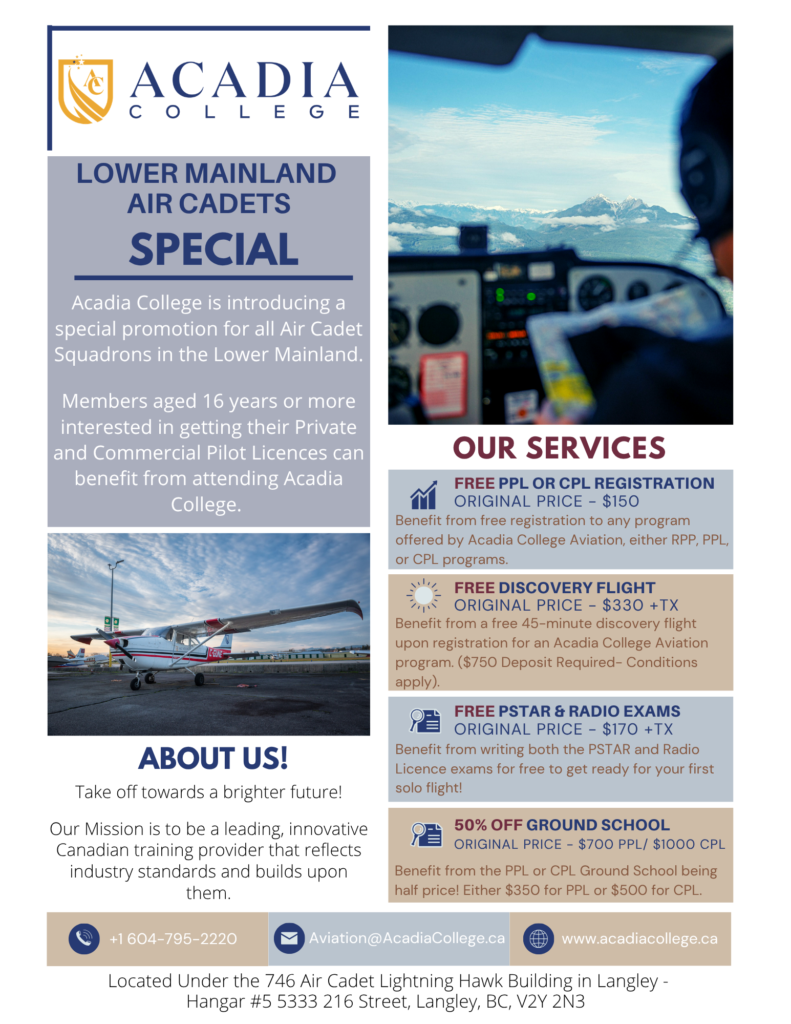 Are you part of an Air Cadet Squadron in BC? If so, we have great news for you! We have a promotion that can help you get started with your flying career. Join Acadia College and take advantage of the following promotions to help kick-start your flying lessons; Free Registration Free discovery flight (conditions apply) …